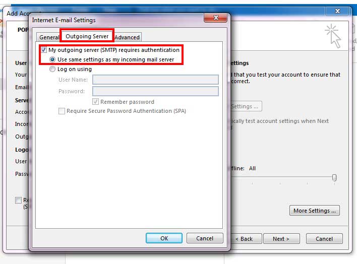 Once the window has opened, you need to click on the “Outgoing Server” tab at the top of the window. Next, you will make sure that “My outgoing server(SMTP) requires authentication” and “Use same settings as my incoming mail server” are selected.
