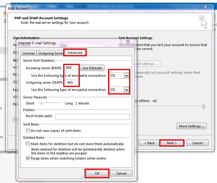 Now you have to click the “advanced” tab at the top. In the “Incoming server” box type in 993. The box “Outgoing server(SMTP)” you need to type in 465. Then, next to each of those boxes there is a dropdown menu; you need to click the SSL option in both of them. After you have done that, click OK then click “next” on the bottom of the “Add Account” window.