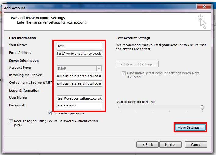 Once you have filled out all of the boxes, you need to change the “Account Type” to IMAP. Now click the “more settings” button.