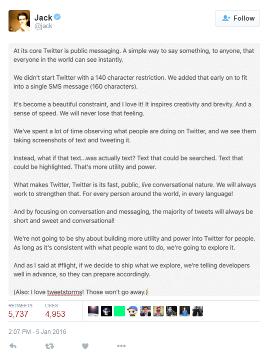 There have been rumours about this for a while and there has been no official announcement to confirm it, but this tweet from Twitter CEO and co-founder Jack Dorsey seems to confirm that they’re thinking about exploring new character limits: Screenshots of long pieces of text can commonly be seen on Twitter as users seek a way to express themselves beyond the current shorter character limit, but this does not allow the content to be searched or used in the same way as a traditional tweet.